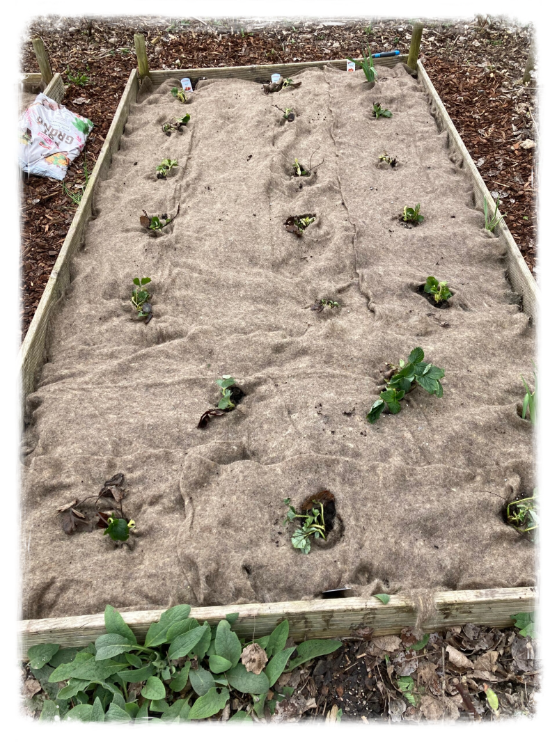 4 rassen doordragers en junidragers kocht ik online bij aardbeiplantje.nl en ik plante ze 2 weken geleden, nu staan ze goed aangeslagen en vol bloemknoppen te wachten op de zon. Het doel van de wol is om slakken te weren, het schijnt dat slakken verdrogen als ze op de wol gaan lopen. zoals te zien op de foto is het een dunne laag wol die je kan kopen op een rol.